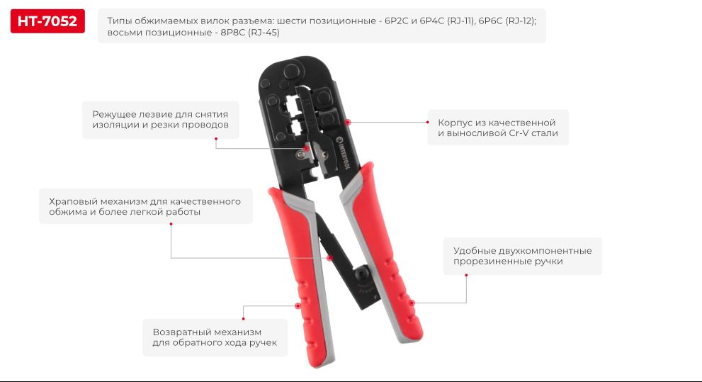 | Тип назначения | Кліщі для обтиску штекерів (RJ11 / RJ12 / RJ14) INTERTOOL HT-7052 |